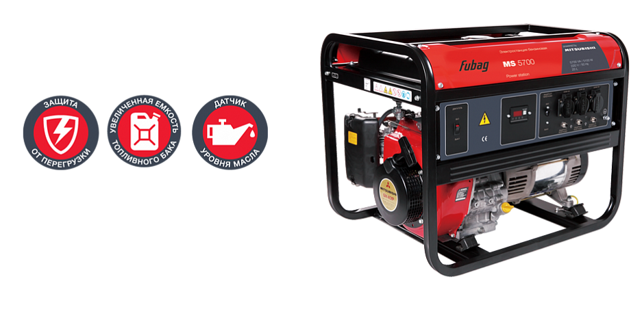 Электростанция оборудована профессиональным двигателем Mitsubishi с верхним расположением клапанов. Номинальная электрическая мощность составляет 5,1 кВт. Запаса мощности у MS 5700 достаточно, чтобы обеспечить питание практически любого электроинструмента, строительного оборудования или садовой техники, а высоконадёжный профессиональный двигатель позволяет работать в течение длительного времени с высокими нагрузками.