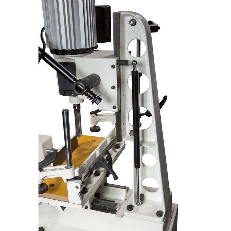 JFM-6 хорошо оснащенный, удобный и точный в работе долбежно-пазовальный станок для любительского применения. Основание, колонна, рабочий стол, упоры и прижимы заготовки выполнены из массивных чугунных отливок, что обеспечивает высокую точность и отсутствие вибраций при работе. В комплект поставки входит металлическая тумба-основание с отсеком для хранения инструментов.