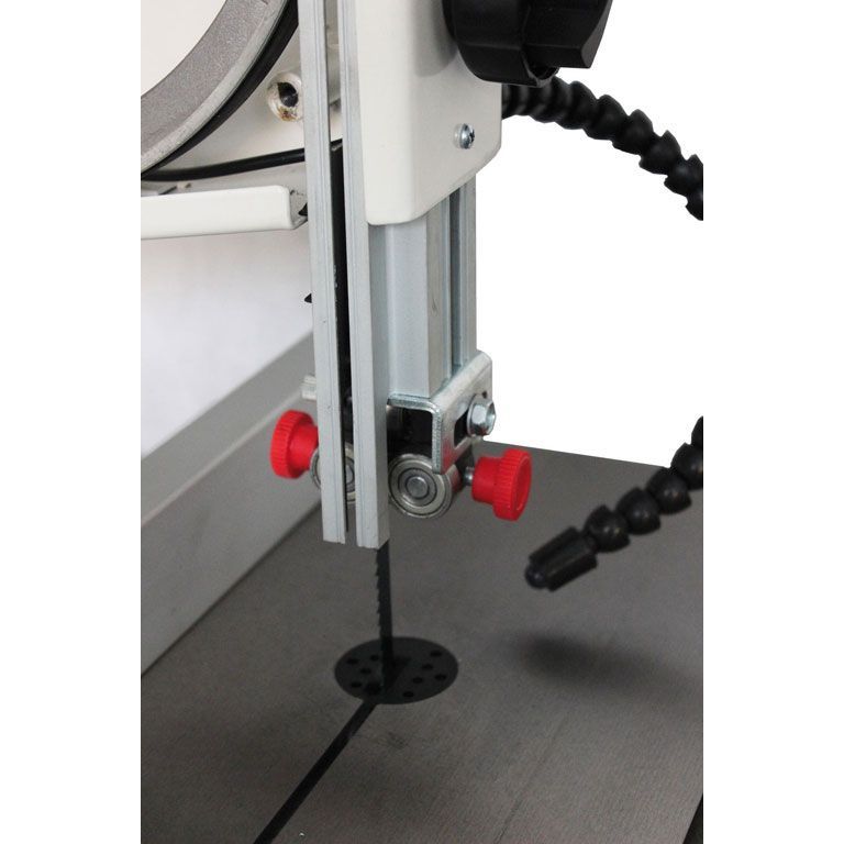 Механизм натяжения пильной ленты оборудован индикатором силы и рычагом для быстрого ослабления перед хранением; при его использовании настройки не сбиваются. Направляющие полотна трехроликовые с подшипниками качения, такой вариант считается наиболее долговечным, меньше всего изнашивает полотно, не приводит к его нагреву от трения. Двери корпуса пилы зафиксированы винтами с барашковой рукояткой, что обеспечивает доступ к механизму для его наладки и надежное запирание без использования вспомогательного инструмента вроде отверток или гаечных ключей.