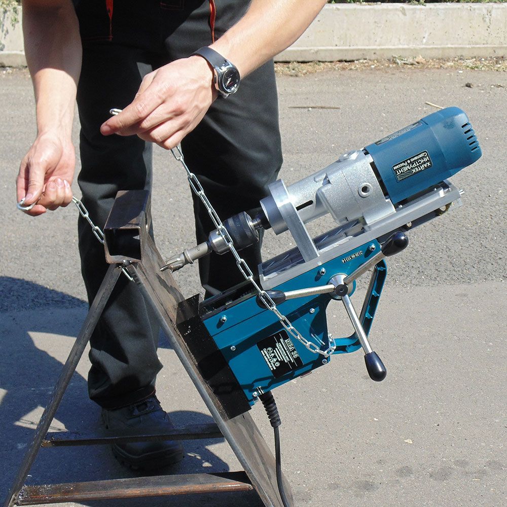 Основой предложения является сверлильный станок 1,3 кВт с Конусом Морзе "2" оснащенный магнитной подошвой с прижимной силой почти 2 тонны. В комплекте сверлильный патрон до 16 мм и страховочная цепь, на случай если при сверлении на высоте произойдет обрыв цепи питания и магнитная подошва деактивируется. В остальном, сверлильный станок на магнитной подошве "MBA 35" работает почти как настольный станок. Вообще, магнитная подошва МВА-35 - это надежный и мощный электромагнит, который удерживает стальной лист толщиной 10 мм с силой 20 000 Н. Этого достаточно, чтобы сверлильный станок на магнитной подошве не отрывался под действием силы человека, даже если висит вверх ногами.