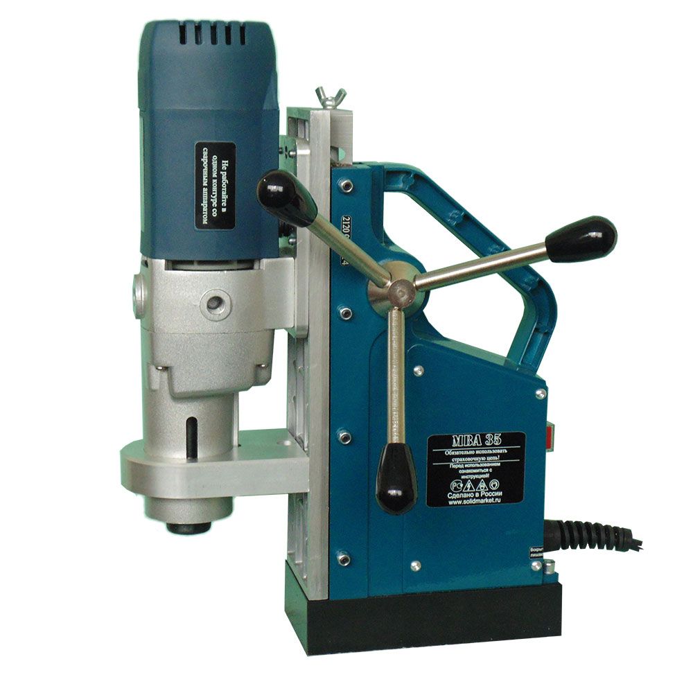 Сверлильный станок на магнитной подошве MBA-35 выпускается с 2013 года. В основу этой модели легли наработки, использованные в более дорогом и профессиональном МВА-50. Таким образом, эти сверлильные станки на магнитном основании отличаются только электроприводами и комплектацией: магнитный сверлильный станок MBA-35 оснащен электроприводом Резекненского Акционерного Общества REBIR. Электропривода этой марки широко известны в России, запасные части к ним распространены и доступны по относительно невысоким ценам.