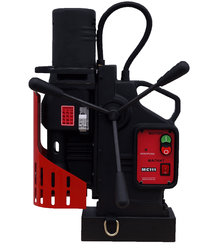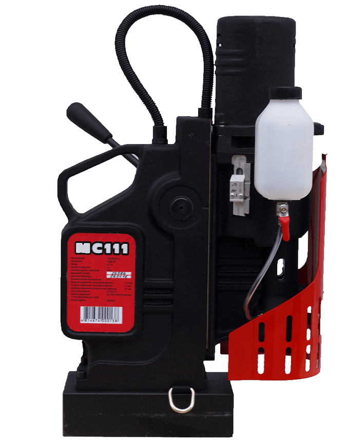 Посадочное же гнездо шпинделя – КМ4, высота от оси шпинделя до основания 65 мм. Прежде всего магнитный станок предназначен для сверления отверстий больших диаметров и глубин при больших нагрузках. Сверлильная машина МС-111 сделала возможным выполнение отверстий диаметром до 110 мм (корончатым сверлом) или диаметром до 50 мм (спиральным сверлом). В сверлильной машине на магнитном основании установлен 4-х скоростной металлический редуктор позволяет работать на малых оборотах, обеспечивая высокий крутящий момент без потери мощности.