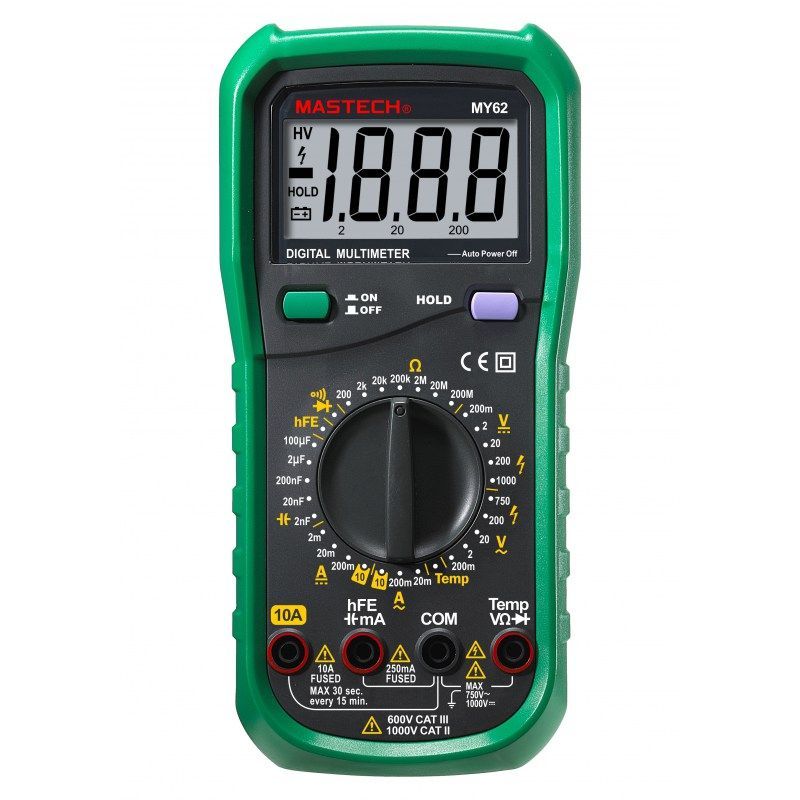 Цифровой мультиметр Mastech MY-62 измеряет величины силы постоянного и переменного тока, постоянного и переменного напряжения, сопротивления, коэффициента усиления биполярных транзисторов, температуры и ёмкости конденсаторов. Высокое входное сопротивление не вносит погрешности при измерениях величин и говорит о высокой точности прибора. Выбор пределов измерения величин производится вручную путем установки нужного положения многопозиционного переключателя.