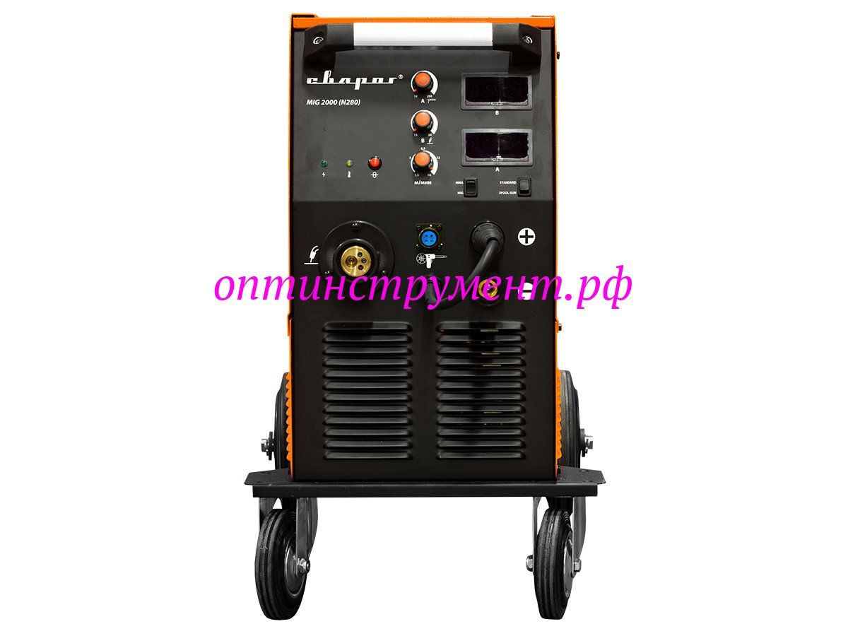 Сварочный инвертор MIG 2000 (N280) предназначен для полуавтоматической сварки в среде защитного газа (MIG/MAG), сварки порошковой проволокой (FCAW), а так же для ручной дуговой сварки покрытым электродом (MMA). Аппарат размещается на тележке с поворотными колесами со специальной площадкой для крепления газового баллона.