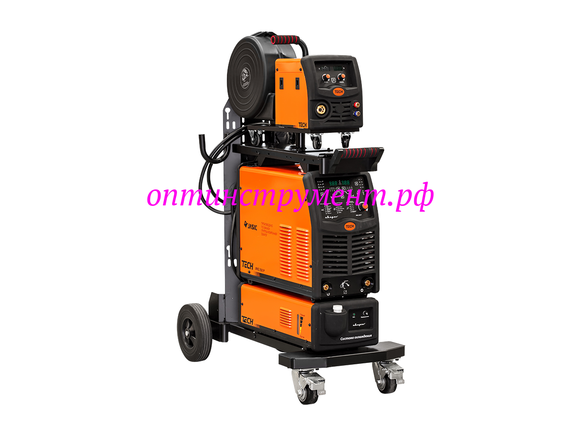 TECH MIG 350 P (N316) состоит из выносного подающего механизма, источника питания и блока жидкостного охлаждения. Все оборудование располагается на удобной тележке с площадкой для крепления баллона. Панель подающего механизма оснащена индикаторами тока и напряжения. На блоке кулера расположен индикатор уровня жидкости, а подключение блока производится без дополнительных проводов.