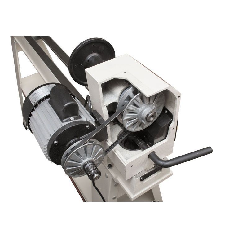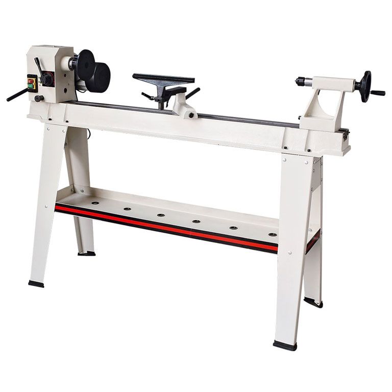 Размеры между центрами и над станиной достаточно велики, чтобы обрабатывать крупные заготовки. Таким задачам соответствует мощный асинхронный 750-ваттный двигатель, имеющий рёбра охлаждения и рассчитанный на продолжительную работу. Для передачи вращения использован клиноременный вариатор, имеющий 10 фиксированных скоростей для удобства переключения. Меняют их, не выключая мотор.