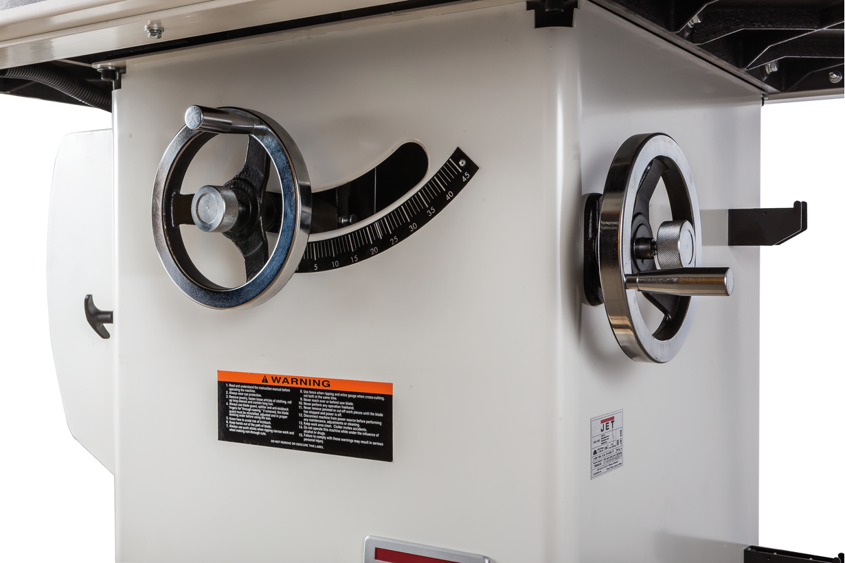 Основные особенности JTAS-12DX, кроме очень мощного мотора, заключаются в глубокой проработке всех нюансов, влияющих на удобство и точность работы. Так, по оценке профессионалов, регулировка высоты и наклона пильного модуля очень точная и плавная. Расклинивающий нож не только опускается вслед за диском, но и легко поддается точной регулировке: для этого достаточно ослабить один эксцентриковый зажим, доступ к которому открывается с верхней стороны стола. Замена диска тоже производится «сверху», причем для блокировки вала предусмотрен специальный механизм. Сама поверхность стола и расширителей (входят в комплект поставки) гладко отшлифована и имеет два Т-образных паза.